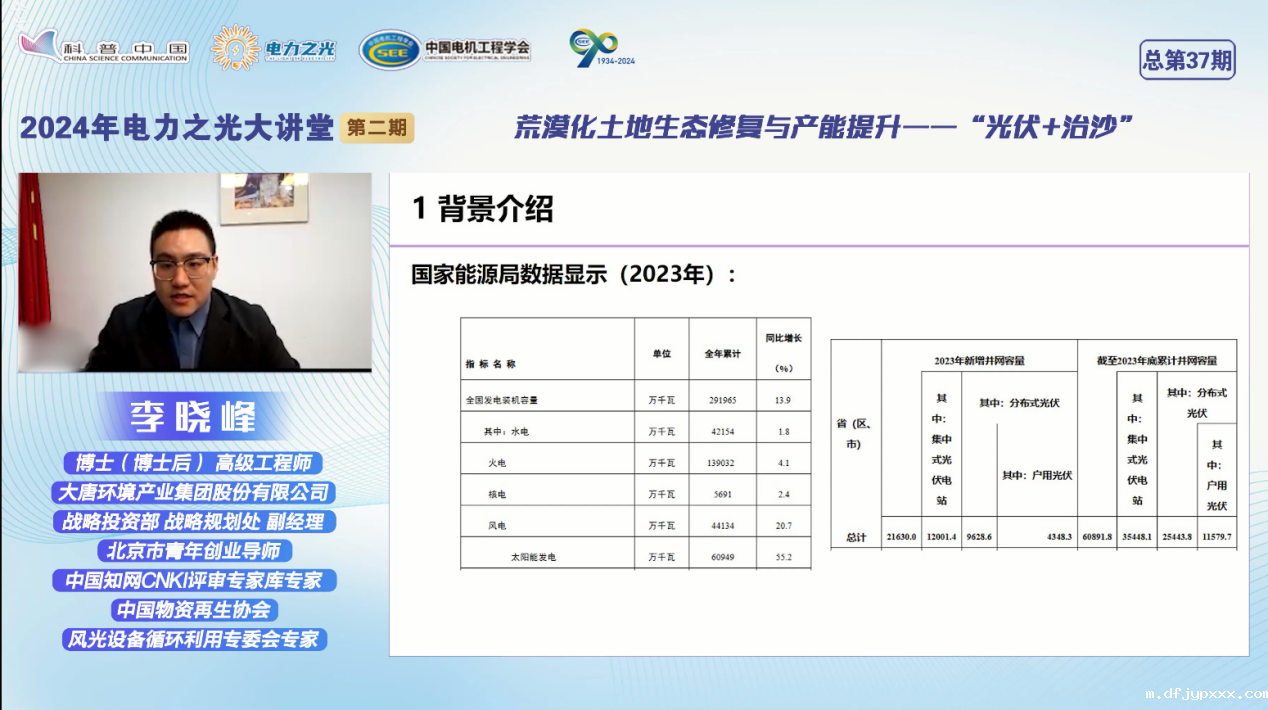 4月12日,大唐环境产业集团股份有限公司李晓峰做客2024年第二期“电力之光大讲堂”,带来专题科普讲座——《荒漠化土地生态修复与产能提...